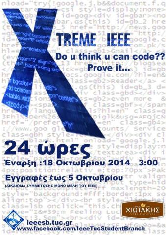 Στις 18/10/14 μέλη της ομάδας IEEE SB TUC του Πολυτεχνείου Κρήτης θα πάρουν μέρος στον παγκόσμιο, 24ωρο διαγωνισμό προγραμματισμού Xtreme 8.0. Ο Xtreme διοργανώνεται για 8η φορά από την IEEE και το Πολυτεχνείο Κρήτης συμμετέχει για 2η συνεχόμενη χρονιά. Θα πραγματοποιηθεί στην αίθουσα συνεδριάσεων της Σχολής Μηχανικών Περιβάλλοντος. Η ώρα εκκίνησης είναι 3.00 π.μ. (18/10) και διαρκεί έως 3 π.μ. (19/10).