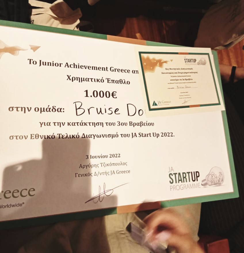 Οι φοιτήτριες Ερικαίτη Κουναλάκη, Εβίνα Ζαρμπούτη και Ελευθερία Παπαδόσηφου, προπτυχιακές φοιτήτριες της Σχολής Αρχιτεκτόνων Μηχανικών του Πολυτεχνείου Κρήτης, έλαβαν το 3ο Βραβείο με την πρότασή τους Bruise Down για τη στρατηγική έξυπνων πόλεων στον Εθνικό Τελικό Διαγωνισμό JA Start Up 2022 - 8ος Φοιτητικός Διαγωνισμός Καινοτομίας και Επιχειρηματικότητας που πραγματοποιήθηκε υβριδικά με μεγάλη επιτυχία από 28 Φεβρουαρίου έως 3 Ιουνίου 2022. Η ομάδα Βruise Down δημιούργησε μια εφαρμογή αφιερωμένη στην αντιμετώπιση των περιστατικών ενδοοικογενειακής και έμφυλης βίας. Δείτε το βίντεο της βράβευσης της ομάδας από την τελετή απονομής που έλαβε χώρα την Παρασκευή 3 Ιουνίου 2022 στο Κέντρο Πολιτισμού Ελληνικός Κόσμος παρουσία του Υφ. Παιδείας Άγγελου Συρίγου.