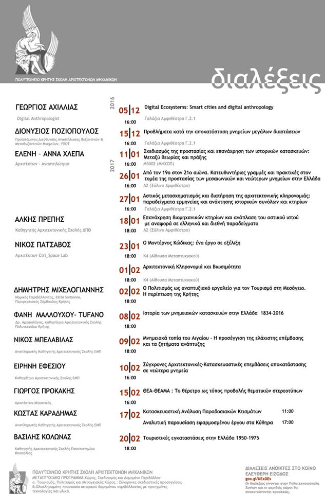 Η Σχολή Αρχιτεκτόνων Μηχανικών του Πολυτεχνείου Κρήτης στο πλαίσιο του Μεταπτυχιακού της Προγράμματος οργανώνει κύκλους διαλέξεων με προσκλημένους διακεκριμένους ομιλητές από τον ακαδημαϊκό αλλά και ευρύτερο χώρο.