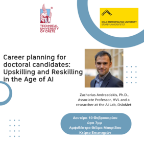 Ο Αναπληρωτής Καθηγητής Ζαχαρίας Ανδρεαδάκης από το Western Norway University of Applied Sciences (HVL) στη Νορβηγία, θα επισκεφθεί το Πολυτεχνείο Κρήτης και θα πραγματοποιήσει διάλεξη τη Δευτέρα 10 Φεβρουαρίου 2025 και ώρα 19:00, στο Αμφιθέατρο «Θέλμα Μαυρίδου» του Κτιρίου Επιστημών, με τίτλο: