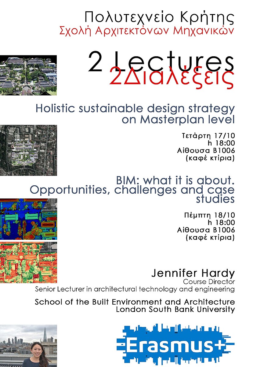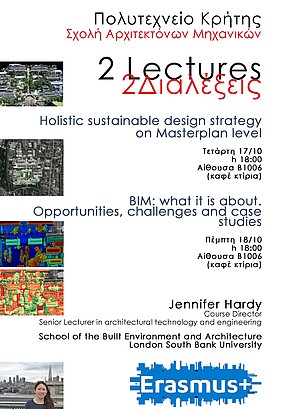 Στο πλαίσιο του προγράμματος Erasmus+ / κινητικότητα προσωπικού για διδασκαλία, η Jennifer Hardi θα δώσει 2 διαλέξεις στη Σχολή Αρχιτεκτόνων Μηχανικών του Πολυτεχνείου Κρήτης με θέμα:
