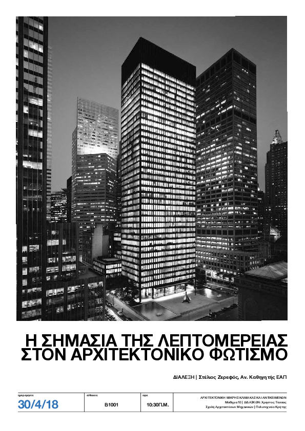 Ο φωτισμός αποτελεί κύριο παράγοντα αντίληψης του χώρου και βασική παράμετρο για την καθημερινή διαβίωση. Η διάλεξη θα επικεντρωθεί όχι μόνο στη σημασία του φωτός και του φωτισμού για την ανάδειξη της αρχιτεκτονικής και τη λειτουργικότητα των κτηρίων, αλλά και για τους ποιοτικούς παράγοντες που επιδρούν στον άνθρωπο.