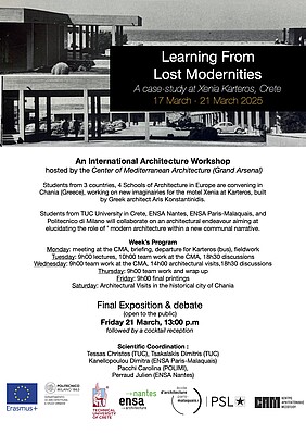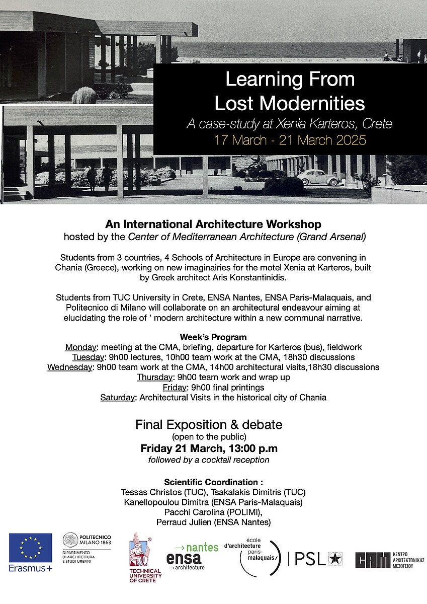 Από την Δευτέρα 17 Μαρτίου 2025 έως την Παρασκευή 21 Μαρτίου 2025 το Πολυτεχνείο Κρήτης και η Σχολή Αρχιτεκτόνων Μηχανικών σε συνεργασία με την Αρχιτεκτονική Σχολή της Νάντης (ENSA Nantes), την Αρχιτεκτονική Σχολή του Παρισιού (ENSA Paris Malaquais) και την Αρχιτεκτονική Σχολή του Μιλάνου (Politecnico di Milano) οργανώνουν σχεδιαστικό εργαστήριο στο πλαίσιο του Erasmus BIP με τίτλο Learning from Lost Modernities: A Xenia Case at Karteros, Crete με θέμα το μοτέλ που σχεδίασε ο αρχιτέκτονας Άρης Κωνσταντινίδης το 1957 στον Καρτερό. Το εργαστήριο θα λάβει χώρα στο Κέντρο Αρχιτεκτονικής Μεσογείου και θα συμμετέχουν σε αυτό πάνω από 70 άτομα.