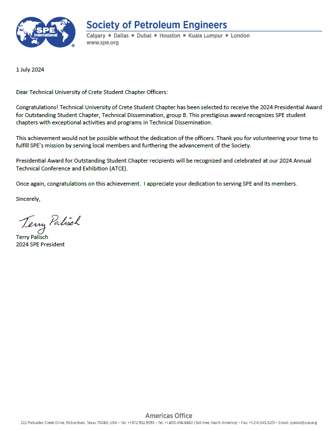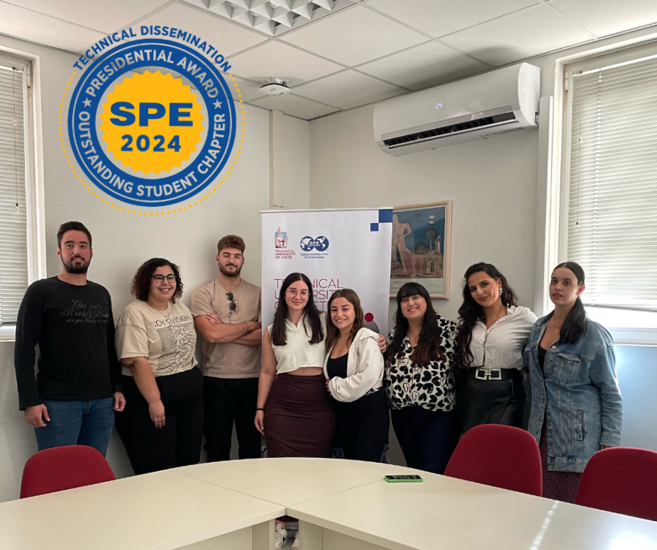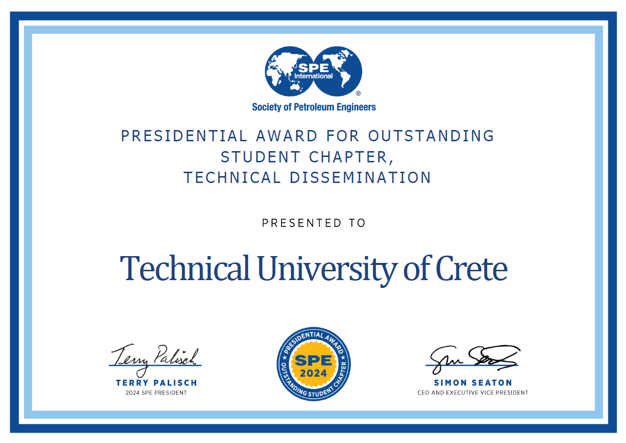 Το Φοιτητικό Παράρτημα SPE του Πολυτεχνείου Κρήτης διακρίθηκε με το μοναδικό Presidential Award for Outstanding Student Chapter στην κατηγορία Technical Dissemination (Τεχνική Διάδοση - ομάδα μεγέθους Β) για το έτος 2024, από τη Διεθνή Κοινότητα Μηχανικών Πετρελαίου (SPE).