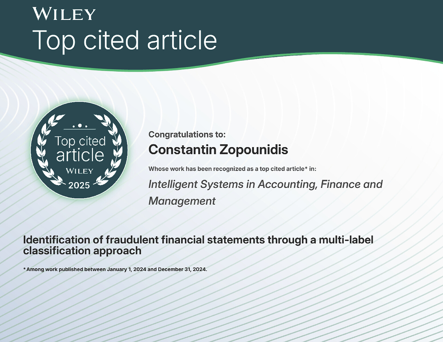 συγκαταλέγεται στα 10 καλύτερα από άποψη βιβλιογραφικών ετεροαναφορών (top-cited) του έγκριτου περιοδικού Intelligent Systems in Accounting, Finance and Management του μεγάλου και πολύ γνωστού Εκδοτικού Οίκου WileyKe.