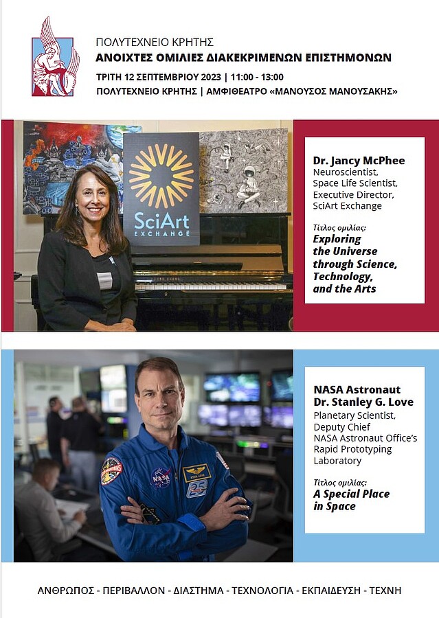 Στις 11, 12 και 13 Σεπτεμβρίου 2023, το Πολυτεχνείο Κρήτης έχει την τιμή να φιλοξενήσει δύο διακεκριμένους επιστήμονες, τον αστροναύτη της NASA, Dr. Stanley G. Love και τη νευροεπιστήμονα με εξειδίκευση στις επιστήμες του διαστήματος Dr. Jancy McPhee, στο πλαίσιο των δράσεων συνεργασίας που έχει αναπτύξει με κορυφαίους διεθνείς και εθνικούς φορείς για την προβολή των σύγχρονων επιστημονικών επιτευγμάτων του, της ενίσχυσης του εκπαιδευτικού του έργου αλλά και της εξωστρέφειας και της διασύνδεσης της έρευνας με την κοινωνία. Ως ακαδημαϊκό ίδρυμα που θεραπεύει τις επιστήμες του Μηχανικού, επιδιώκει διαρκώς τη σύνδεση της έρευνας αιχμής με χρήσιμες εφαρμογές στο περιβάλλον και στην καθημερινότητα των πολιτών για τη βελτίωση της ποιότητας ζωής.