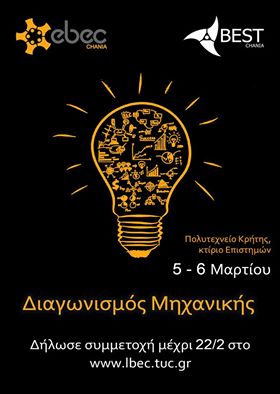 Η ομάδα BEST Chania του Πολυτεχνείου Κρήτης κρατάει την παράδοση και για 7η συνεχόμενη χρονιά διοργανώνει τον τοπικό διαγωνισμό μηχανικής! Την πρώτη ημέρα του διαγωνισμού, οι φοιτητές θα έχουν την ευκαιρία να πάρουν μέρος στο Case Study, το οποίο αποτελεί την επίλυση ενός θεωρητικού, τεχνικού ή επιχειρησιακού προβλήματος που συμβαίνει στην πραγματική ζωή ή τη βιομηχανία, χρησιμοποιώντας τις διαθέσιμες πληροφορίες που τους δίνονται. Τη 2η ημέρα του διαγωνισμού, οι φοιτητές διαγωνίζονται πάνω στο Team Design, δηλαδή στο σχεδιασμό, την κατασκευή και τη συναρμολόγηση μιας λειτουργικής συσκευής ως λύση σε ένα τεχνικό πρόβλημα, σε περιορισμένη ποσότητα χρόνου και πόρων. Οι δυο νικητήριες ομάδες (μια από κάθε τομέα) , θα συμμετέχουν στον Πανελλαδικό διαγωνισμό Μηχανικής (NBEC, National BEST Engineering Competiton) που θα γίνει στα Χανιά τον Απρίλιο.