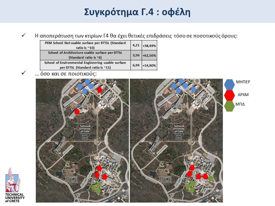 Το κτιριακό συγκρότημα Γ.4, σχεδιάστηκε στις αρχές της δεκαετίας του 2000, προκειμένου να λειτουργήσει ως «συμπληρωματικό» κτίριο-υποδομή των Σχολών ΜΠΔ και ΗΜΜΥ. Η κατασκευή του δεν ολοκληρώθηκε ποτέ, καθώς ο εργολάβος κηρύχθηκε έκπτωτος, εγκατέλειψε το εργοτάξιο και στην συνέχεια ξεκίνησε πτωχευτική διαδικασία. Το κτίριο έχει επιφάνεια 5.500 τετραγωνικών μέτρων και η πρόταση προς την Ευρωπαϊκή Τράπεζα περιελάμβανε τη χρήση του για την στέγαση των Σχολών Αρχιτεκτόνων Μηχανικών και Μηχανικών Παραγωγής και Διοίκησης, καθώς και τη δημιουργία ενός σύγχρονου και ενεργειακά αποδοτικού Data Center στους χώρους των μηχανολογικών εγκαταστάσεων. Το νέο κτίριο θα αντιμετωπίσει οριστικά το στεγαστικό ζήτημα και την πολυδιάσπαση της Σχολής Αρχιτεκτόνων, ενώ θα έχει και θετικές επιδράσεις σε όλες τις άλλες Σχολές.