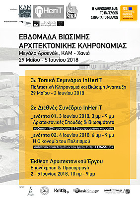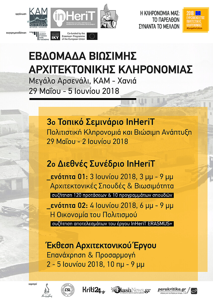 Το InHeriT: Promoting Cultural Heritage as a Generator of Sustainable Development, μια πρωτοβουλία της Σχολής Αρχιτεκτόνων Μηχανικών του Πολυτεχνείου Κρήτης, σε συνεργασία με την ΚΕΠΠΕΔΗΧ-ΚΑΜ, το Τμήμα Οικονομικών Επιστημών του ΕΚΠΑ, την Αρχιτεκτονική Σχολή του Πανεπιστημίου Νεάπολις Πάφου, το Middlesex University Business School, το Μανιατάκειον Ίδρυμα και το Fondazione Flaminia, στο πλαίσιο του ERASMUS+ KA2 Adult Education, διοργανώνουν την Εβδομάδα Βιώσιμης Πολιτιστικής Κληρονομιάς στα Χανιά, στο Κέντρο Αρχιτεκτονικής της Μεσογείου, την περίοδο Τρίτη 29 Μαΐου – Τρίτη 5 Ιουνίου.