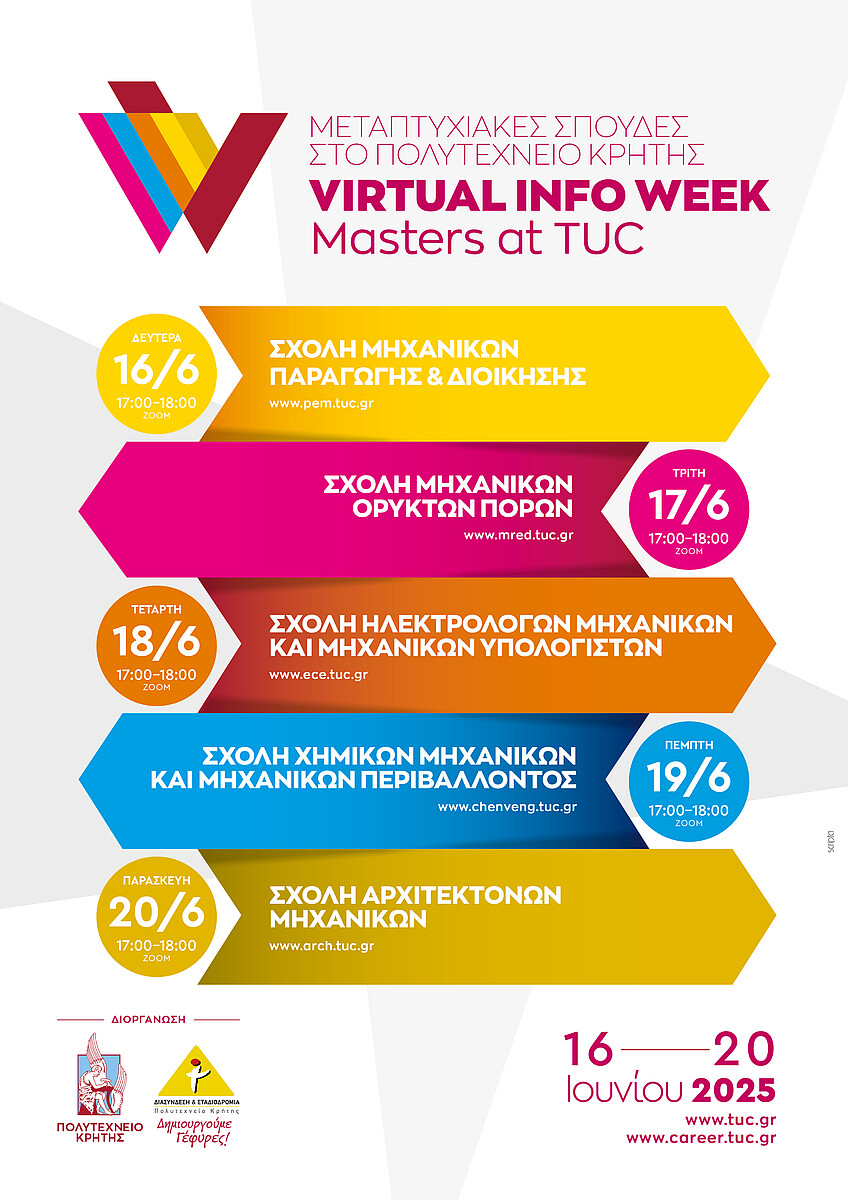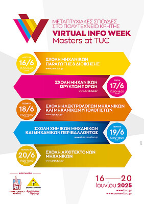 Το Γραφείο Διασύνδεσης και Σταδιοδρομίας του Πολυτεχνείου Κρήτης, στο πλαίσιο των δράσεων του, διοργανώνει, Εβδομάδα Διαδικτυακών Παρουσιάσεων των Προγραμμάτων Μεταπτυχιακών Σπουδών στο Πολυτεχνείο Κρήτης " Virtual Info Week Masters at TUC", σε συνεργασία με τις Σχολές του Ιδρύματος.