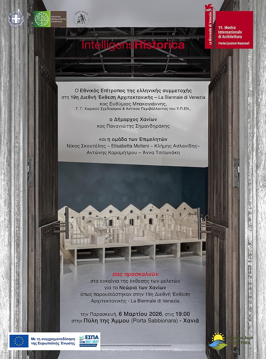 Τα εγκαίνια της Έκθεσης / παρουσίασης των Μελετών και Προπλάσματος για την επανάχρηση των Νεωρίων στο Παλιό Λιμάνι των Χανίων, όπως παρουσιάστηκε στην 19η Διεθνή Έκθεση Αρχιτεκτονικής στην Βενετία θα πραγματοποιηθούν την Παρασκευή 6 Μαρτίου 2026 και ώρα 19:00, στην Πύλη της Άμμου (Porta Sabbionara) στα Χανιά.