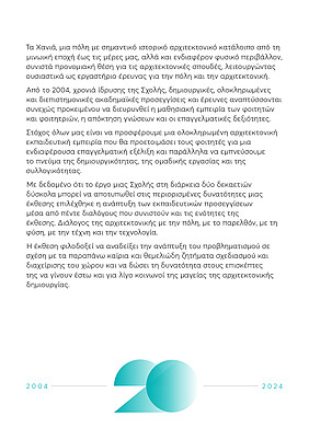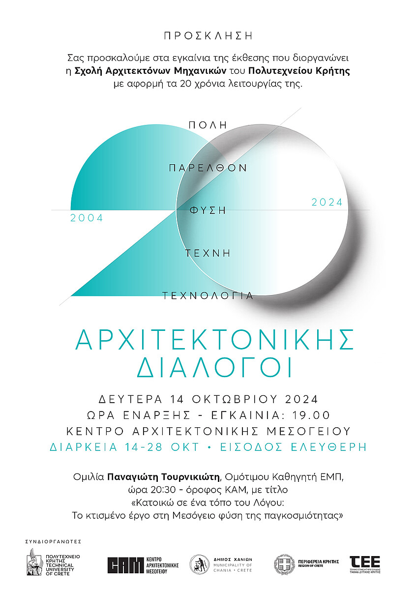 H Σχολή Αρχιτεκτόνων Μηχανικών του Πολυτεχνείου Κρήτης, με αφορμή τα 20 χρόνια λειτουργίας της, διοργανώνει Έκθεση με τίτλο «Αρχιτεκτονικής Διάλογοι» από 14 έως 28 Οκτωβρίου 2024, στο Κέντρο Αρχιτεκτονικής Μεσογείου.