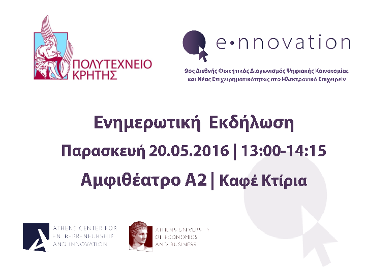 Με στόχο την ανάδειξη και προώθηση της καινοτομίας και της νεανικής επιχειρηματικότητας στο Πολυτεχνείο Κρήτης διοργανώνεται, την Παρασκευή 20 Μαΐου και ώρα 13:00 έως 14:15, ενημερωτική παρουσίαση του 9ο Φοιτητικό Διαγωνισμό Ψηφιακής Καινοτομίας & Νεανικής Επιχειρηματικότητας, ennovation, στο ξύλινο αμφιθέατρο A2 (απέναντι από τη βιβλιοθήκη του ΠΚ).