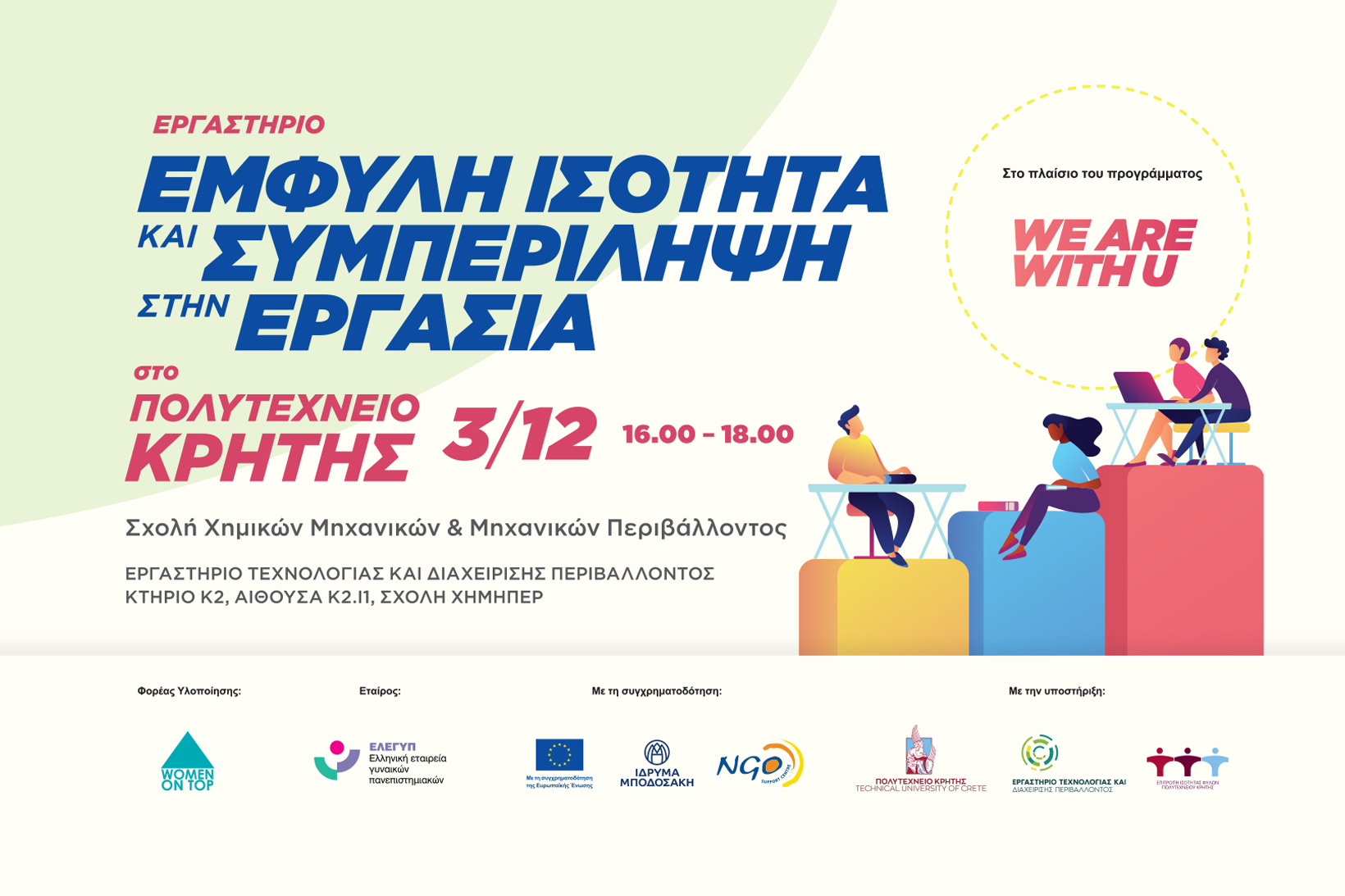 Την Τρίτη 3 Δεκεμβρίου 2024 και ώρα 16:00-18:00, στην Αίθουσα Κ2.Ι1 της Σχολής Χημικών Μηχανικών και Μηχανικών Περιβάλλοντος, ο Οργανισμός για την επαγγελματική και οικονομική ενδυνάμωση των γυναικών Women On Top, θα επισκεφθεί το Πολυτεχνείο Κρήτης για να υλοποιήσει, με την υποστήριξη της Επιτροπής Ισότητας Φύλων του ΠΚ, εργαστήριο για την έμφυλη ισότητα & συμπερίληψη στην εργασία, στο πλαίσιο του προγράμματος We are with U: Ευαισθητοποίηση Φοιτητ(ρι)ών για Έμφυλη Ισότητα στην Εργασία.