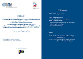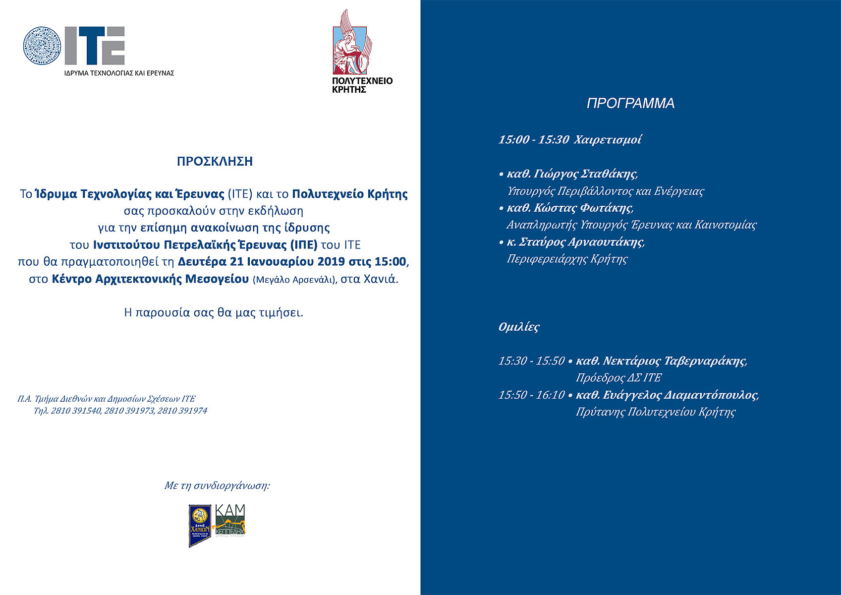 Το Ίδρυμα Τεχνολογίας και Έρευνας και το Πολυτεχνείο Κρήτης σας προσκαλούν στην εκδήλωση για την επίσημη ανακοίνωση της Ίδρυσης του Ινστιτούτου Πετρελαϊκής Έρευνας (ΙΠΕ) του ΙΤΕ, που θα πραγματοποιηθεί τη Δευτέρα 21 Ιανουαρίου 2019 και ώρα 15.00, στο Κέντρο Αρχιτεκτονικής Μεσογείου (Μεγάλο Αρσενάλι), στα Χανιά.