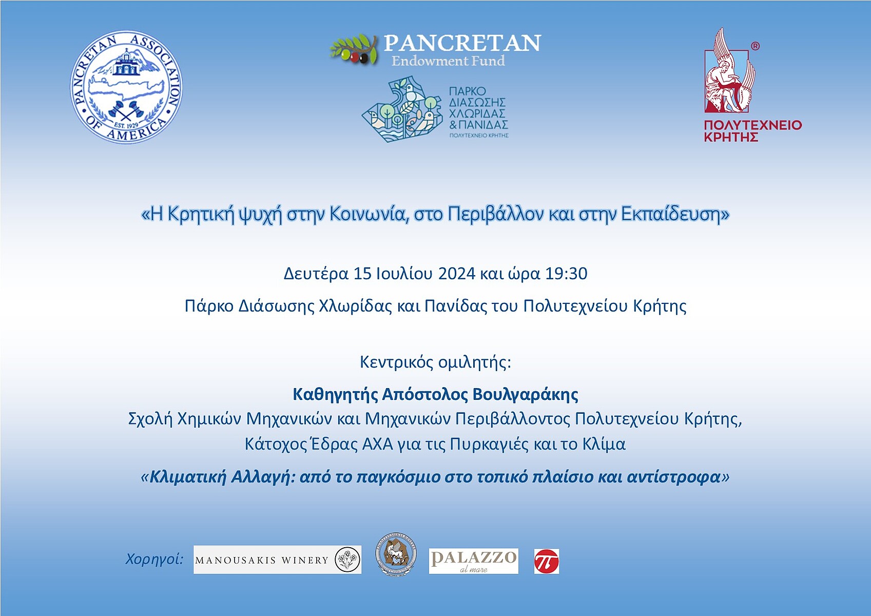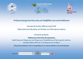 Η Παγκρητική Ένωση Αμερικής και το Παγκρήτιο Κληροδότημα σε συνεργασία με το Πολυτεχνείο Κρήτης διοργανώνουν, τη Δευτέρα 15 Ιουλίου 2024 και ώρα 19:30, εκδήλωση με τίτλο: