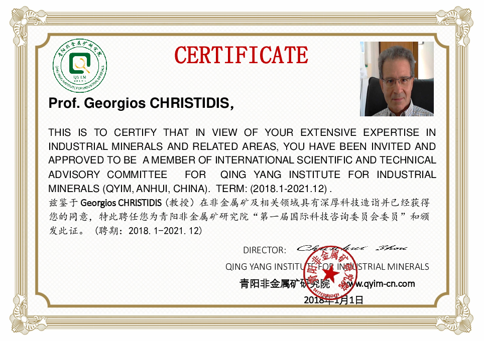 Ο Καθηγητής της Σχολής Μηχανικών Ορυκτών Πόρων Γεώργιος Χρηστίδης επιλέχθηκε μέλος της Διεθνούς Επιστημονικής και Τεχνικής Συμβουλευτικής Επιτροπής του Ινστιτούτου Έρευνας Βιομηχανικών Ορυκτών QING YANG (QYIM) στην Κίνα, με θητεία 1-1-2018 έως 31-12-2021. Επίσης ο κος Χρηστίδης έχει εκλεγεί μέλος του Συμβουλίου της Διεθνούς Επιτροπής για τη Μελέτη των Αργίλων (AIPEA). Η θητεία του λήγει το 2021.