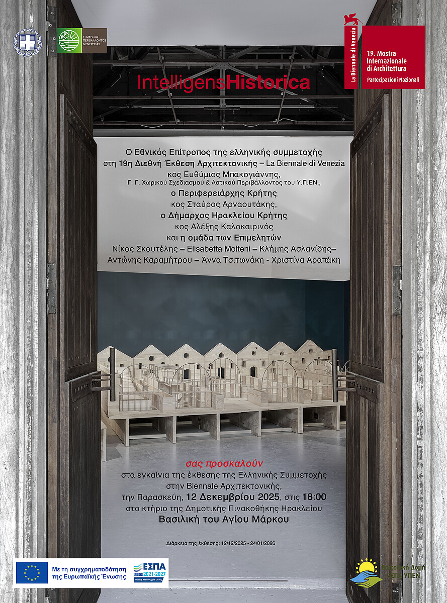 Η Έκθεση Αρχιτεκτονικής με τίτλο IntelligensHistorica παρουσιάζεται στη Δημοτική Πινακοθήκη Ηρακλείου, στη Βασιλική του Αγίου Μάρκου, από 12 Δεκεμβρίου 2025 έως 23 Ιανουαρίου 2026. Τα εγκαίνια της Έκθεσης θα πραγματοποιηθούν την Παρασκευή 12 Δεκεμβρίου 2025 και ώρα 18:00.