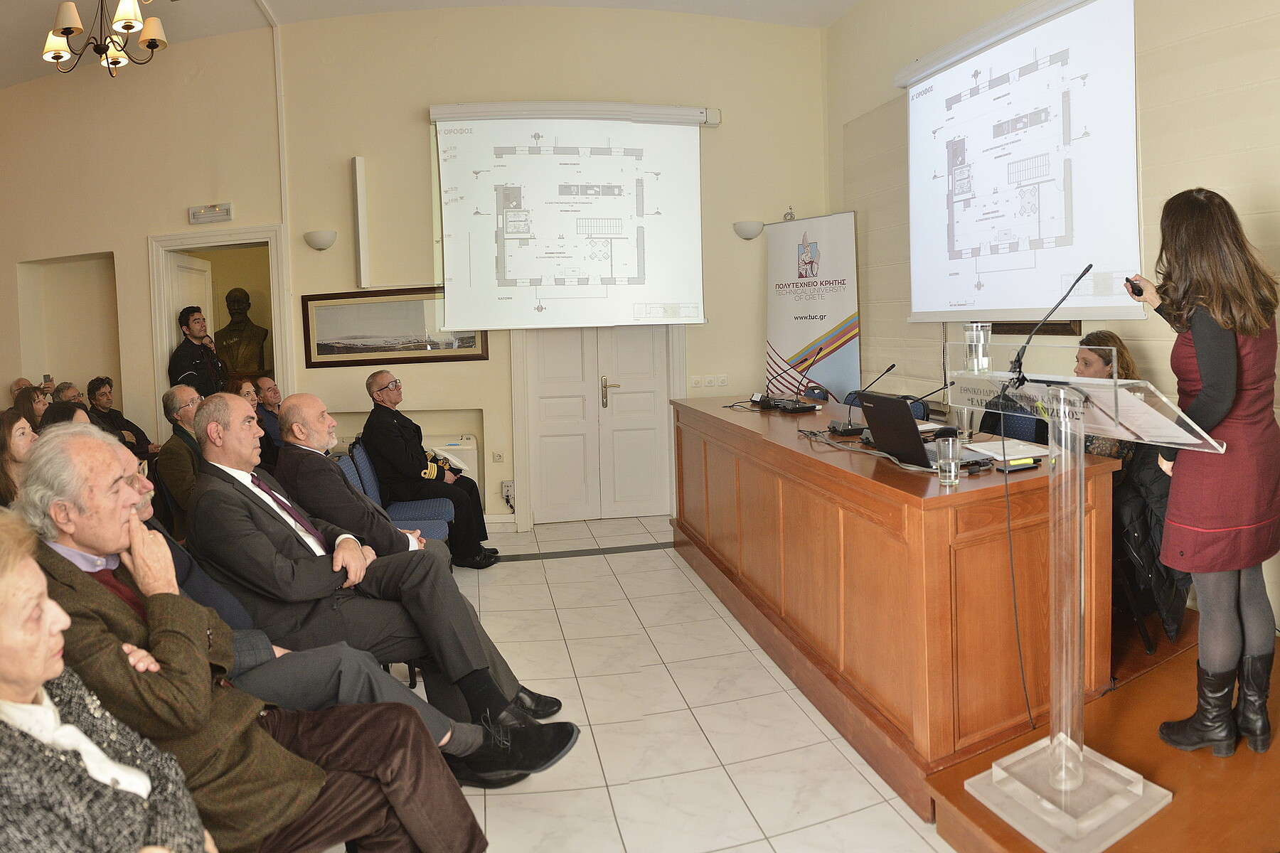 Κεντρική ομιλήτρια της εκδήλωσης ήταν η κα Δέσποινα Τσάφου, Αρχιτέκτων Μηχανικός, εκπρόσωπος του μελετητικού γραφείου Σύνθεση & Έρευνα ΕΠΕ που εκπόνησε τη μελέτη. Στην παρουσίαση της Μελέτης αναφέρθηκαν θέματα που αφορούν την εκθεσιακή οργάνωση, τις συλλογές και τα εκθέματα, τις θεματικές ενότητες, το οργανόγραμμα και τη χωροθέτηση της έκθεσης, κ.α. Ο σκοπός του προτεινόμενου εκθεσιακού χώρου, όπως φάνηκε στην παρουσίαση της μελέτης, καθορίζεται σε μεγάλο βαθμό από την πρωτοβουλία του Πολυτεχνείου της Κρήτης να δημιουργήσει έναν πολυχώρο μάθησης και πολιτισμού στο κτίριο της πρώην Γαλλικής σχολής, ενισχύοντας με αυτόν τον τρόπο τους δεσμούς του με την τοπική κοινωνία.