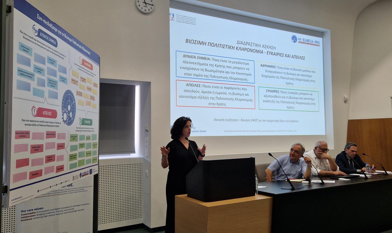 Ο συντονιστής του HI-EURECA-PRO Καθηγητής Θεοχάρης Τσούτσος της Σχολής Χημικών Μηχανικών και Μηχανικών Περιβάλλοντος του Πολυτεχνείου Κρήτης παρουσίασε τις ευκαιρίες από το HI-EURECA-PRO για τη Βιώσιμη Πολιτιστική Κληρονομιά: Καινοτομία, Συνέργειες και Προοπτικές Ανάπτυξης στην Κρήτη και ο Καθηγητής Κωνσταντίνος-Αλκέτας Ουγγρίνης, Αντιπρύτανης Έρευνας και Καινοτομίας του Πολυτεχνείου Κρήτης εισήγαγε το θέμα της υφιστάμενης κατάστασης στον τομέα της πολιτιστικής κληρονομιάς, εμβαθύνοντας στις προκλήσεις για τη Βιωσιμότητα και την Καινοτομία στο νησί. Η Καθηγήτρια Δέσποινα Διμέλλη της Σχολής Αρχιτεκτόνων Μηχανικών του Πολυτεχνείου Κρήτης συντόνισε διαδραστική άσκηση, όπου οι συμμετέχοντες εντόπισαν δυνατά σημεία, αδυναμίες, ευκαιρίες και απειλές για τη βιώσιμη διαχείριση της πολιτιστικής κληρονομιάς. Επίσης, η κα Σταυρούλα Τουρνάκη, επικεφαλής Ευρωπαϊκών προγραμμάτων του Εργαστηρίου Ανανεώσιμων και Βιώσιμων Ενεργειακών Συστημάτων της Σχολής Χημικών Μηχανικών και Μηχανικών Περιβάλλοντος του Πολυτεχνείου Κρήτης παρουσίασε τους στόχους, τις δράσεις και τις συνέργειες του Δικτύου HI-EURECA-PRO για τη Βιώσιμη Πολιτιστική Κληρονομιά στην Κρήτη. Η εκδήλωση ολοκληρώθηκε με ανοικτή συζήτηση, κατά την οποία οι συμμετέχοντες διατύπωσαν προτάσεις για μελλοντικές δράσεις και τόνισαν την ανάγκη για διατομεακή συνεργασία, συντονισμό και συνεχή ανταλλαγή γνώσης.