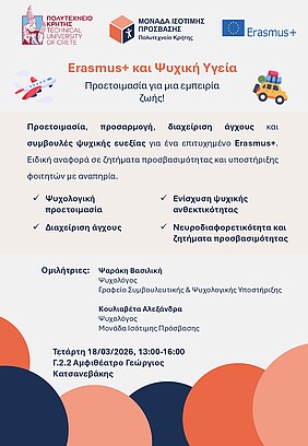 οι οποίες θα κάνουν παρέμβαση με θέμα "Προετοιμασία, προσαρμογή, διαχείριση άγχους και συμβουλές ψυχικής ευεξίας για ένα επιτυχημένο Erasmus+. Ειδική αναφορά σε ζητήματα προσβασιμότητας και υποστήριξης φοιτητών με αναπηρία."