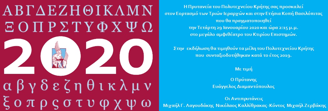 Η Πρυτανεία του Πολυτεχνείου Κρήτης σας προσκαλεί στον εορτασμό των Τριών Ιεραρχών, της επίσημης ημέρας των γραμμάτων και της παιδείας, και στην ετήσια κοπή της βασιλόπιτας του Ιδρύματος, την Τετάρτη 29 Ιανουαρίου 2020 και ώρα 2:15 μ.μ. στο μεγάλο αμφιθέατρο του Κτιρίου Επιστημών (1ος όροφος).