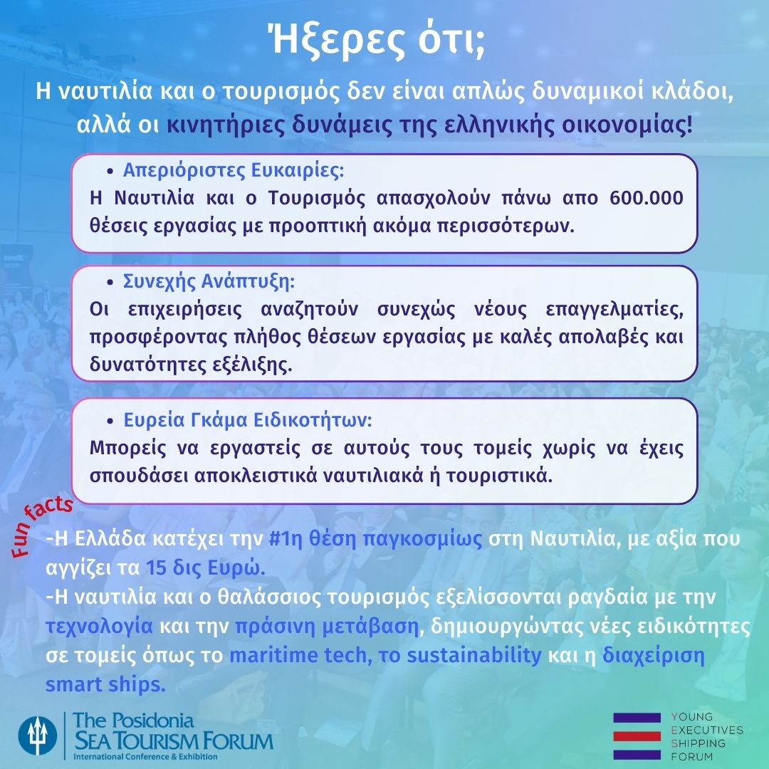 Η ναυτιλία αποτελεί έναν από τους βασικότερους πυλώνες της ελληνικής οικονομίας. Η Ελλάδα αποτελεί το 0,13% του παγκόσμιου πληθυσμού και διαχειρίζεται 5.700 πλοία, το 60% του Ευρωπαϊκού και το 21% παγκόσμιου στόλου, παραμένοντας πρώτη και διαγράφοντας μακρά ιστορία στον κλάδο. Εξίσου σημαντικός για την ελληνική οικονομία είναι και ο τουρισμός, ο οποίος συνεισφέρει περίπου το 25% του ΑΕΠ της χώρας και προσφέρει χιλιάδες θέσεις εργασίας. Ο θαλάσσιος τουρισμός, οι κρουαζιέρες, η ακτοπλοΐα και οι σχετικές υπηρεσίες δημιουργούν ένα εκτεταμένο δίκτυο επαγγελματικών ευκαιριών. Κατ’ επέκταση, είναι καθοριστικής σημασίας οι φοιτητές να γνωρίσουν τα επαγγέλματα που περιλαμβάνει το ναυτιλιακό πλέγμα (cluster) της γαλάζιας οικονομίας, το οποίο απαρτίζεται από 3.000 εταιρείες και προσφέρει πάνω από 150 διαφορετικές επαγγελματικές κατευθύνσεις, αναδεικνύοντας την πληθώρα ευκαιριών απασχόλησης στον κλάδο.