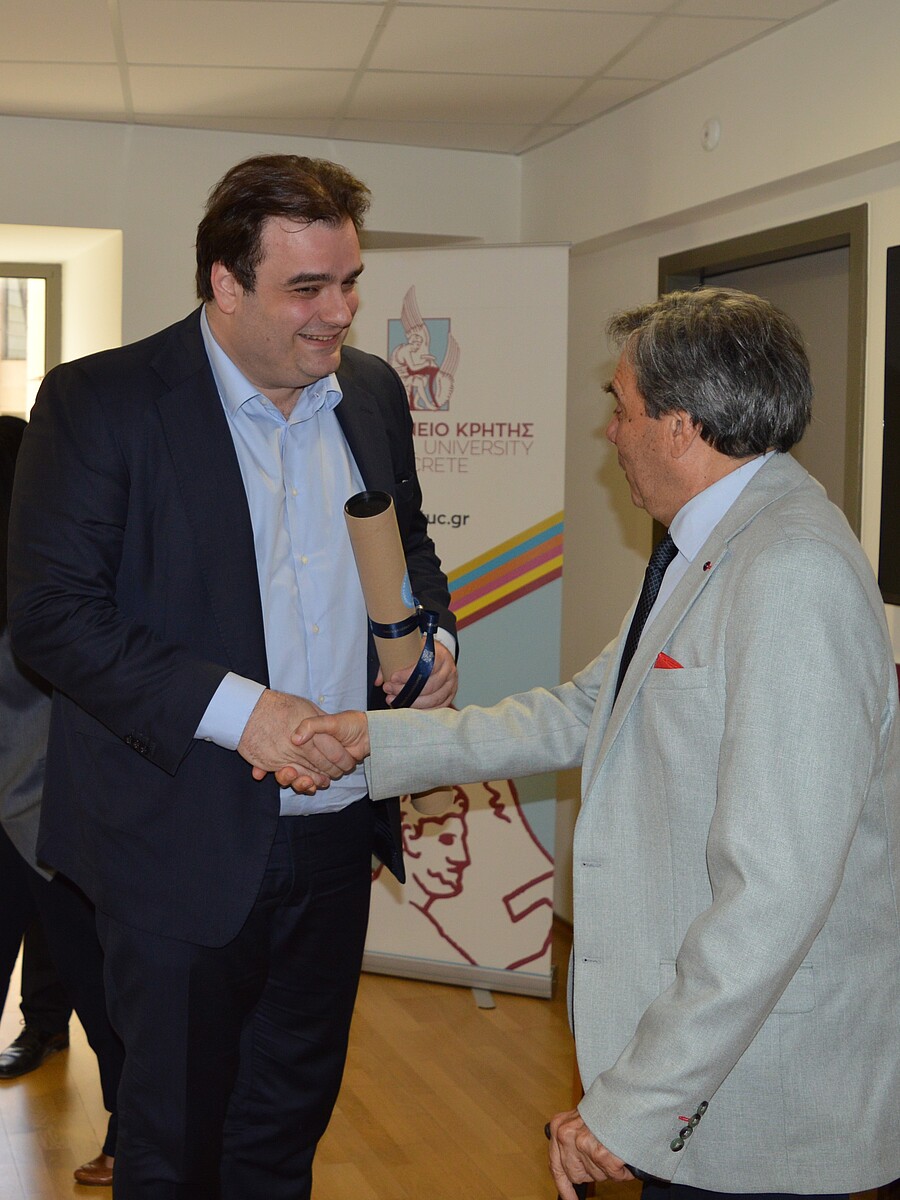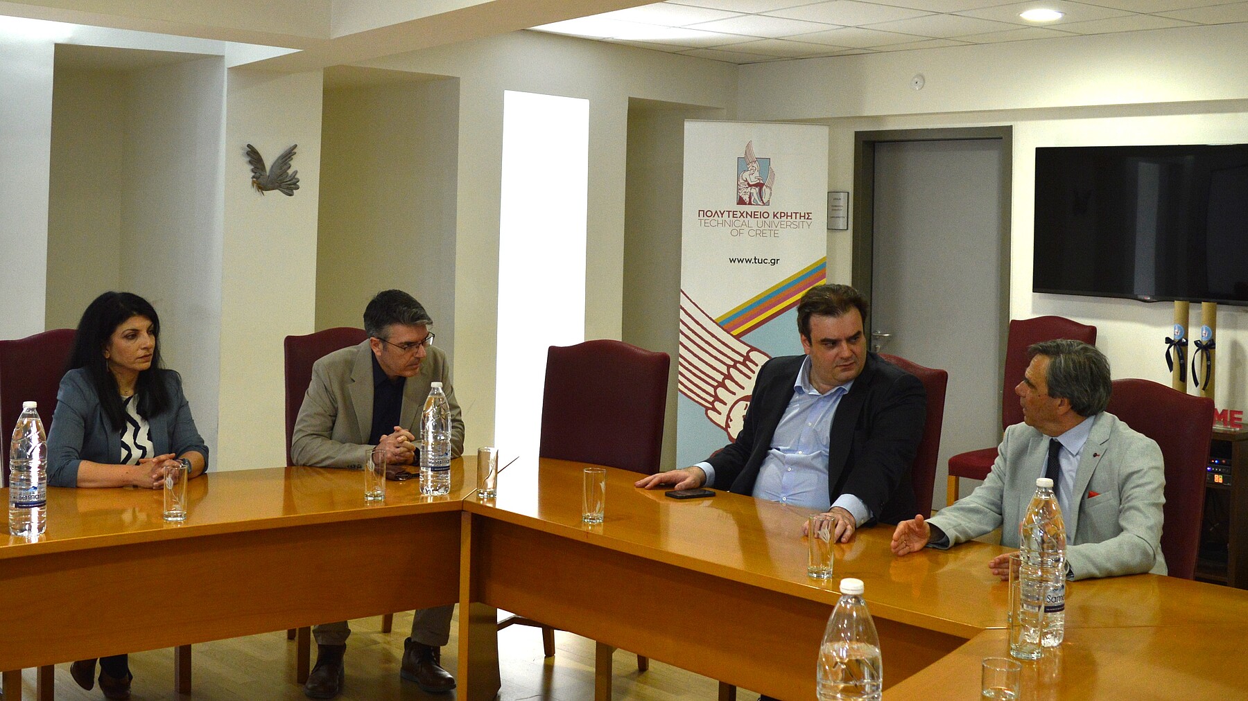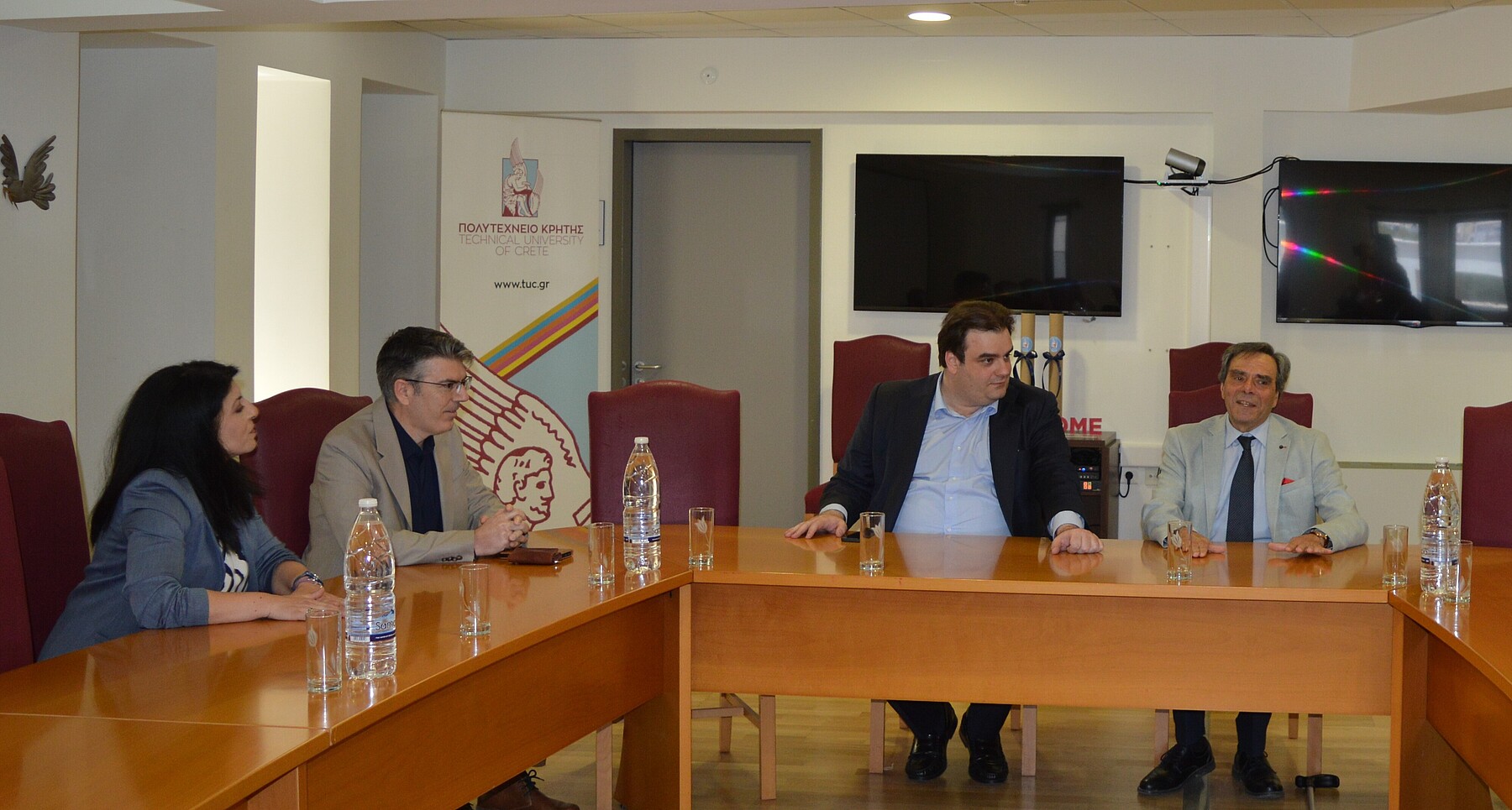 Τον Υπουργό υποδέχθηκαν στο Πολυτεχνείο Κρήτης ο Πρύτανης Καθηγητής Μιχαήλ Ζερβάκης, η Αντιπρύτανις Οικονομικών και Ανάπτυξης Καθηγήτρια Δανάη Βενιέρη και ο Αντιπρύτανης Ακαδημαϊκών Υποθέσεων, Διά Βίου Μάθησης και Εξωστρέφειας Αναπληρωτής Καθηγητής Φώτιος Κανέλλος.