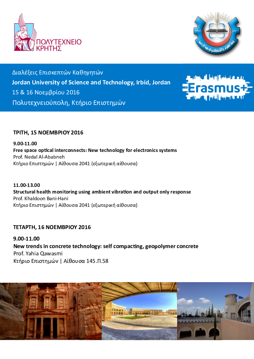 Στις 15 και 16 Νοεμβρίου 2016, πραγματοποιήθηκαν τρεις επιστημονικές διαλέξεις από Επισκέπτες Καθηγητές του Πανεπιστημίου της Ιορδανίας Jordan University of Science and Technology στην Πολυτεχνειούπολη, στο πλαίσιο του προγράμματος διεθνoύς κινητικότητας Erasmus+.
