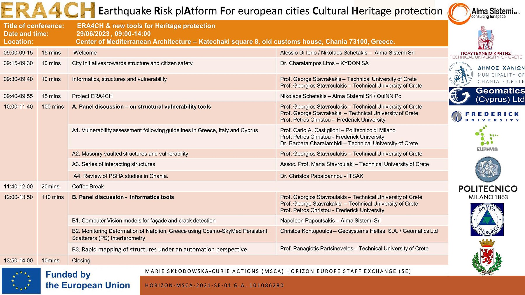 Στο πλαίσιο του Ευρωπαϊκού ερευνητικού έργου ERA4CH (Earthquake Risk Platform For European Cities Cultural Heritage Protection), που έχει ως αντικείμενο την μελέτη της σεισμικής επικινδυνότητας και την προστασία πολιτιστικής κληρονομιάς, το Πολυτεχνείο Κρήτης, ως βασικός εταίρος του έργου, σε συνεργασία με τον Δήμο Χανίων, διοργανώνει Επιστημονική Ημερίδα την Πέμπτη 29 Ιουνίου 2023, από 9:00 έως 14:00, στο Κέντρο Αρχιτεκτονικής της Μεσογείου (ΚΑΜ) και συγκεκριμένα στο Θέατρο «Μίκης Θεοδωράκης» στα Χανιά. Στην ημερίδα θα παρουσιασθούν εργαλεία πληροφορικής και υπολογιστικής μηχανικής για την εκτίμηση σεισμικού κινδύνου σε κατασκευές πολιτιστικής κληρονομιάς στα κέντρα ευρωπαϊκών πόλεων, μεταξύ των οποίων και η πόλη των Χανίων.