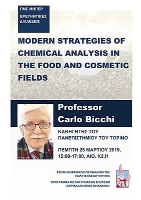 Στο πλαίσιο του Προγράμματος Μεταπτυχιακών Σπουδών της Σχολής Μηχανικών Περιβάλλοντος του Πολυτεχνείου Κρήτης θα δοθούν δύο διαλέξεις από τον Καθηγητή του Πανεπιστημίου του Τορίνο Dr. Carlo Bicchi, την Πέμπτη 28/03/2018 και ώρες 15:00 έως 17:00, στην Αίθουσα Κ2.Ι1, στην Πολυτεχνειούπολη.