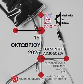 Εθελοντική Αιμοδοσία διοργανώνει το Πολυτεχνείο Κρήτης σε συνεργασία με τη φοιτητική ομάδα Mechanics in Action και το Τμήμα Αιμοδοσίας του Γενικού Νοσοκομείου Χανίων «Ο Άγιος Γεώργιος».