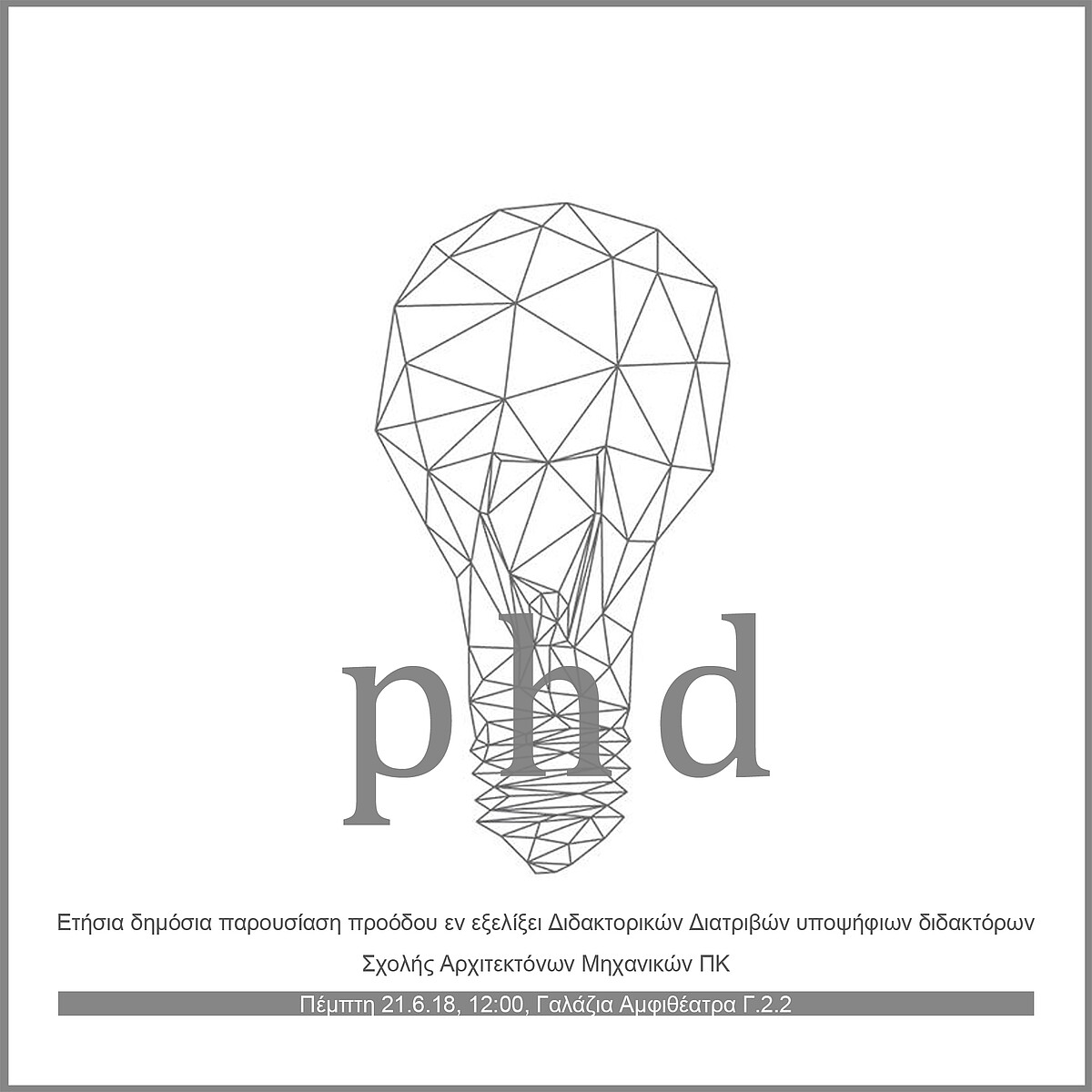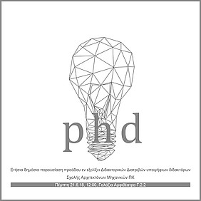 Την Πέμπτη 21/6/2018 και ώρα 12:00 στo Αμφιθέατρο "Γεώργιος Κατσανεβάκης" (Γ.2.2) θα πραγματοποιηθεί η ετήσια δημόσια παρουσίαση προόδου των εν εξελίξει Διδακτορικών Διατριβών της Σχολής Αρχιτεκτόνων Μηχανικών.