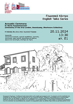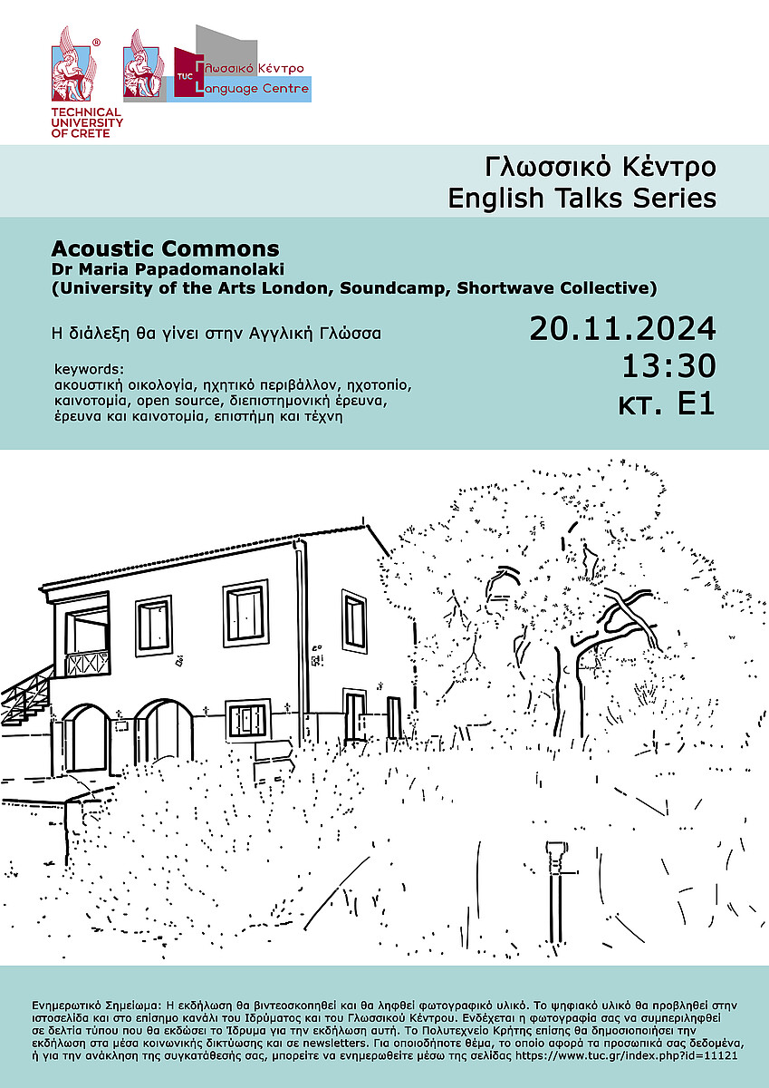 Το θέμα της πρώτης διάλεξης αφορά άμεσα το Πολυτεχνείο Κρήτης, καθώς αξιοποιώντας το ηχητικό περιβάλλον του Πάρκου Διάσωσης Χλωρίδας και Πανίδας του Πολυτεχνείου Κρήτης, με την καινοτόμο χρήση customized Raspberry Pi-based πομπών ήχου, μας εισάγει σε έννοιες της ακουστικής οικολογίας, ηχοτοπίου, στο πλαίσιο διεπιστημονικής έρευνας και καινοτομίας. Η διάλεξη, επίσης, θα εστιάσει σε best practices, που έχουν στοιχειοθετηθεί μετά την ολοκλήρωση του project με έμφαση στη δημιουργία open source toolkits και libraries για την εκπομπή ηχοτοπίων, αλλά και στη σύμπραξη Ακαδημαϊκών Ιδρυμάτων Τεχνολογίας και Τεχνών με Φορείς Πολιτισμού, Αστικά Πάρκα και τοπικές κοινότητες. Το project “Acoustic Commons” χρηματοδοτήθηκε από το πρόγραμμα Creative Europe της Ευρωπαϊκής Ένωσης και ολοκληρώθηκε επιτυχώς το 2022.