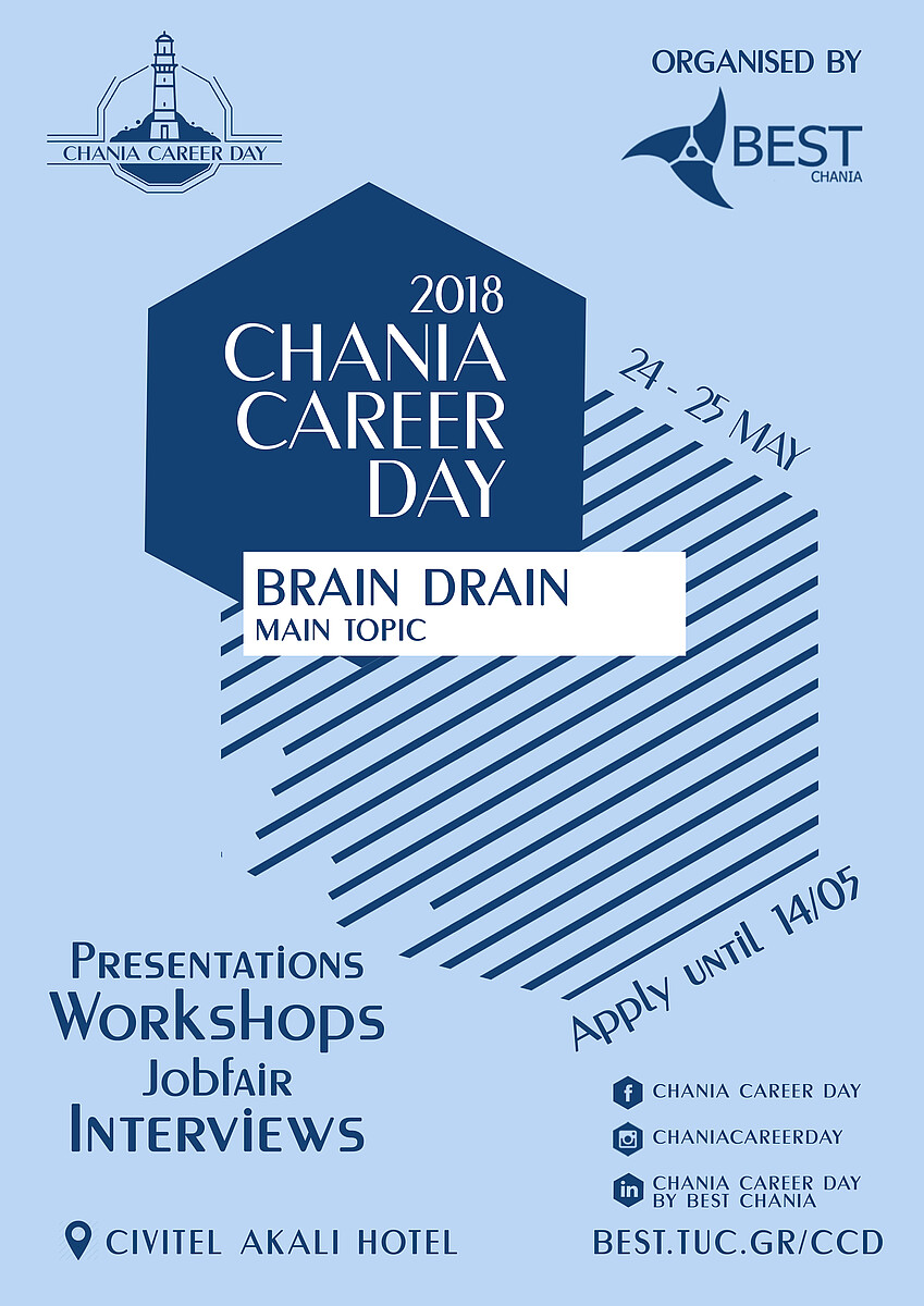 Το Chania Career Day (CCD), που διοργανώνει ο φοιτητικός σύλλογος BEST Chania του Πολυτεχνείου Κρήτης, αποτελεί μια διημερίδα σχετική με τις ευκαιρίες καριέρας και επαγγελματικής αποκατάστασης και έχει ως θεματική το Brain Drain στην Ελλάδα. Η διοργάνωση θα διεξαχθεί στις 24-25 Μαΐου 2018 στους συνεδριακούς χώρους του Akali Hotel.