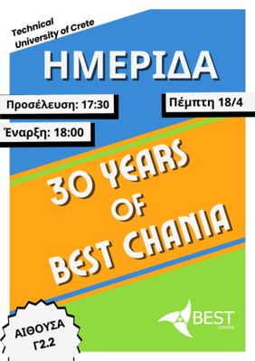 Ο BEST Chania Πολυτεχνείου Κρήτης διοργανώνει ημερίδα με αφορμή τη συμπλήρωση 30 χρόνων λειτουργίας του, την Πέμπτη 18 Απριλίου 2024 και ώρα 18:00, στο Αμφιθέατρο «Γεώργιος Κατσανεβάκης» (Γ2.2) του Πολυτεχνείου Κρήτης.