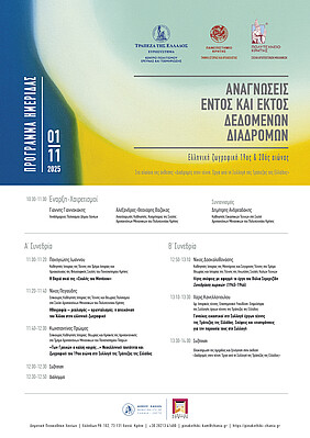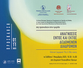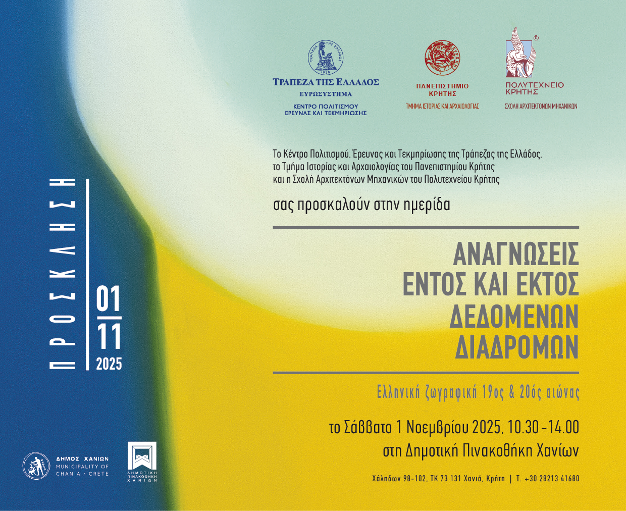 Το Κέντρο Πολιτισμού, Έρευνας και Τεκμηρίωσης της Τράπεζας της Ελλάδος, σε συνεργασία με το Τμήμα Ιστορίας και Αρχαιολογίας του Πανεπιστημίου Κρήτης και τη Σχολή Αρχιτεκτόνων Μηχανικών του Πολυτεχνείου Κρήτης, διοργανώνει την ημερίδα «Αναγνώσεις εντός και εκτός δεδομένων διαδρομών. Ελληνική ζωγραφική, 19ος & 20ος αιώνας» στο πλαίσιο της έκθεσης «Διαδρομές στην τέχνη. Έργα από τη Συλλογή της Τράπεζας της Ελλάδος», το Σάββατο 1 Νοεμβρίου 2025, από τις 10:30 έως τις 14:00, στη Δημοτική Πινακοθήκη Χανίων.