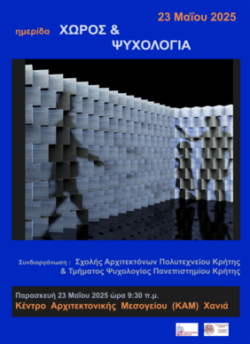 Η Σχολή Αρχιτεκτόνων Μηχανικών του Πολυτεχνείου Κρήτης και το Τμήμα Ψυχολογίας του Πανεπιστημίου Κρήτης συνδιοργανώνουν ημερίδα με τίτλο «Χώρος και Ψυχολογία», την Παρασκευή 23 Μαΐου 2025 και ώρα 09:30 στα Χανιά, στο Κέντρο Αρχιτεκτονικής Μεσογείου (ΚΑΜ), με ελεύθερη είσοδο για το κοινό.