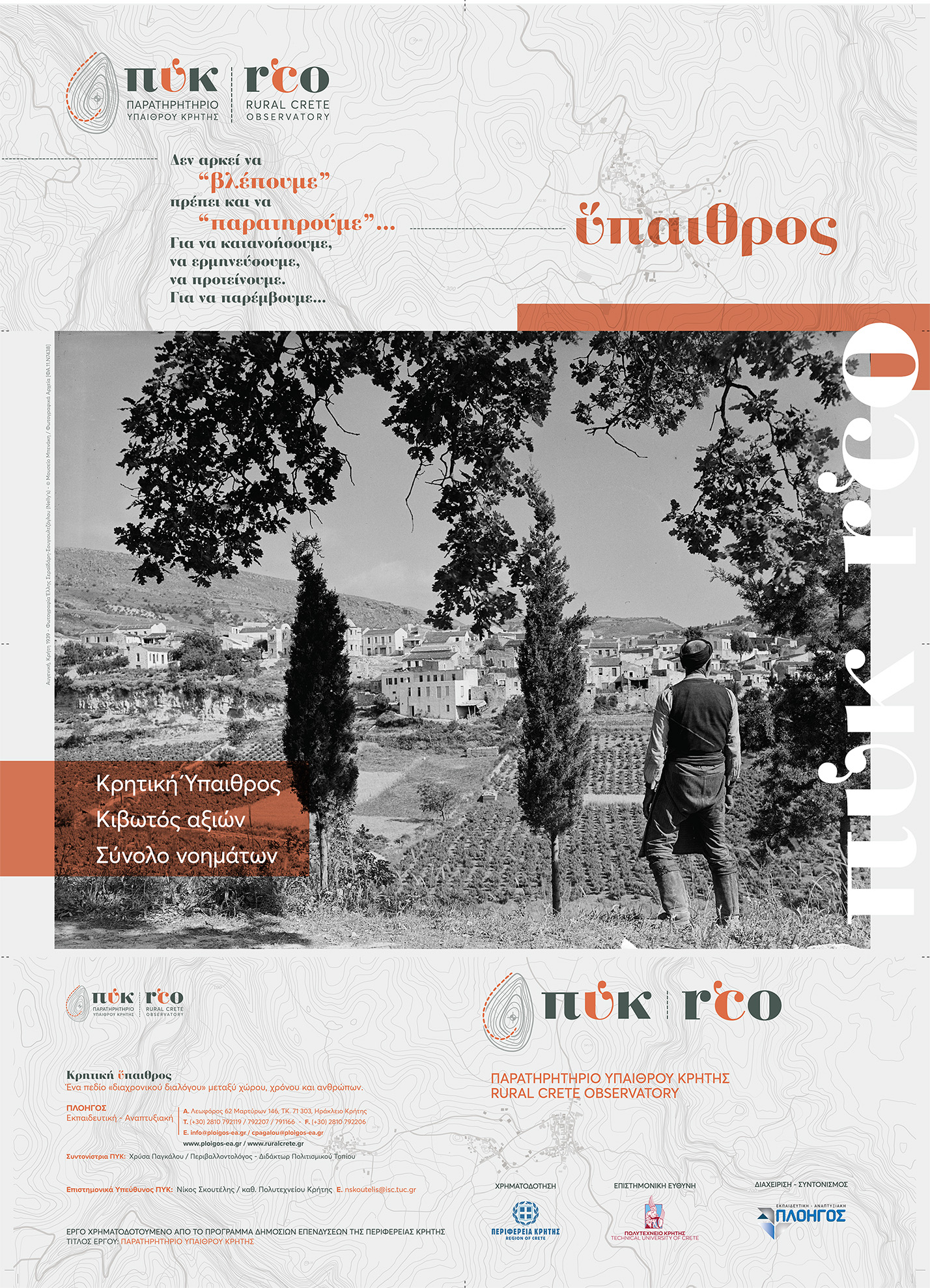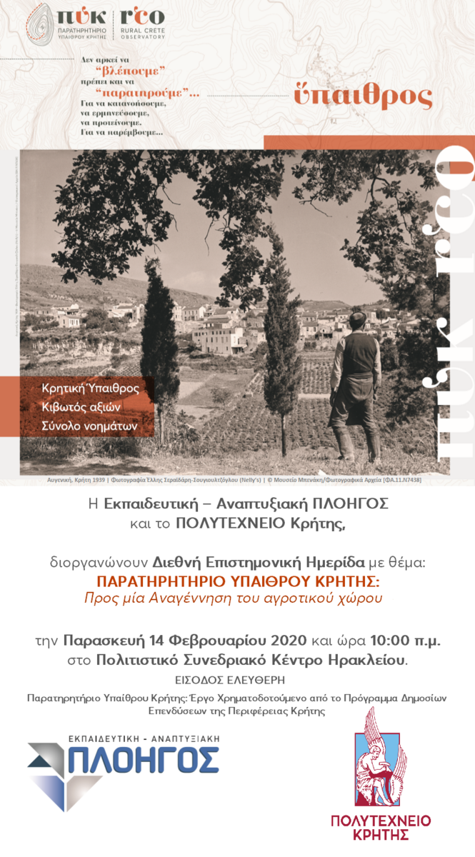 Η Εκπαιδευτική–Αναπτυξιακή "Πλοηγός" και το Πολυτεχνείο Κρήτης διοργανώνουν Διεθνή Επιστημονική Ημερίδα με θέμα Παρατηρητήριο Υπαίθρου Κρήτης: Προς μία Αναγέννηση του Αγροτικού Χώρου, την Παρασκευή 14 Φεβρουαρίου 2020 και ώρα 10:00 π.μ. στο Πολιτιστικό και Συνεδριακό Κέντρο Ηρακλείου. Το Παρατηρητήριο Υπαίθρου Κρήτης (ΠυΚ) είμαι μία Δομή, στην οποία συμπράττουν η Περιφέρεια Κρήτης, το Πολυτεχνείο Κρήτης και η "Πλοηγός" Εκπαιδευτική-Αναπτυξιακή, και η οποία θα επιχειρήσει με διεπιστημονικό τρόπο να συμβάλλει και να στηρίξει ουσιαστικά τους φορείς σχεδιασμού και λήψεως αποφάσεων στην ύπαιθρο της Κρήτης, καθώς και την Κρητική κοινωνία ως τελικό αποδέκτη των προτεινόμενων δράσεων.