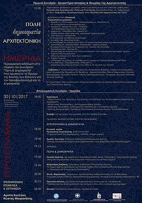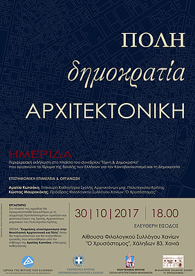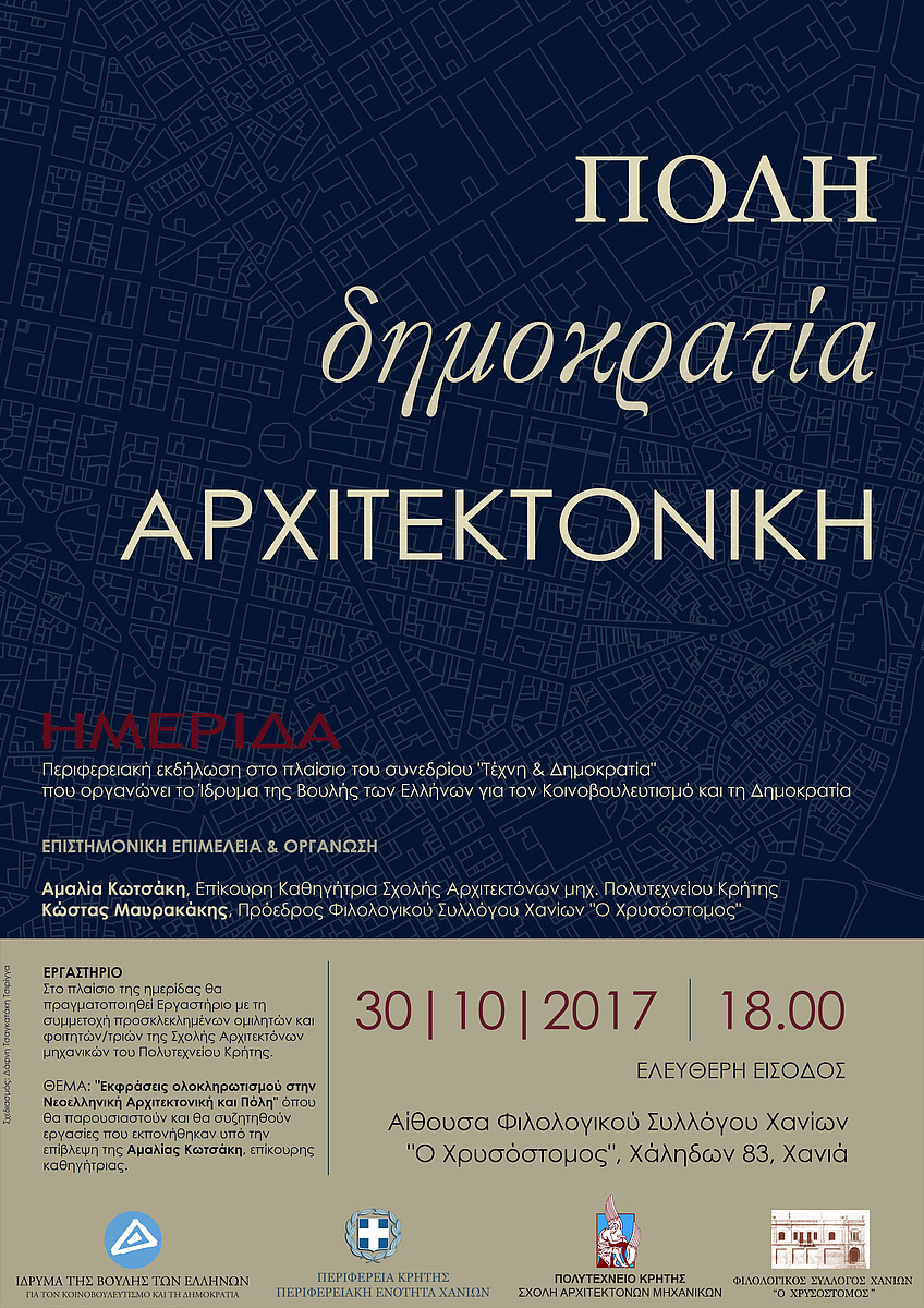 Το Ίδρυμα της Βουλής των Ελλήνων για τον Κοινοβουλευτισμό και τη Δημοκρατία, η Περιφερειακή Ενότητα Χανίων, η Σχολή Αρχιτεκτόνων Μηχανικών του Πολυτεχνείου Κρήτης και ο Φιλολογικός Σύλλογος Ο Χρυσόστομος σας προσκαλούν σε ημερίδα με τίτλο: ΠΟΛΗ, δημοκρατία, ΑΡΧΙΤΕΚΤΟΝΙΚΗ, τη Δευτέρα 30 Οκτωβρίου 2017 ώρα 18.00 στην Αίθουσα του Φιλολογικού Συλλόγου Ο Χρυσόστομος στα Χανιά.