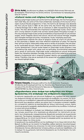 Στο Α’ Μέρος με τίτλο «Η διεθνής εμπειρία και η αναζήτηση διαλόγου» θα παρουσιαστούν περιπτώσεις συναφών πολιτιστικών διαδρομών από ομιλητές με μακρά εμπειρία στο θέμα. H Sylvia Aulet Διευθύντρια της έδρας της UNESCO «Πολιτιστικές Πολιτικές και Συνεργασία» στο Πανεπιστήμιο της Girona, Ισπανία και Συντονίστρια του προγράμματος Grau en Turisme θα παρουσιάσει περιπτώσεις θρησκευτικών πολιτιστικών διαδρομών στην Ισπανία, ενώ ο Πέτρος Κοσμάς, επικ. καθηγητής στη Σχολή Διοίκησης Τουρισμού, Φιλοξενίας και Επιχειρηματικότητας του Τεχνολογικού Πανεπιστημίου Κύπρου θα αναφερθεί στην πολιτιστική διαδρομή της χερσονήσου του Ακάμα στην Κύπρο, περιοχή με αρκετά κοινά με τον Αποκόρωνα. Ο Δημήτρης Μιχελογιάννης, δικηγόρος και σύμβουλος της Περιφέρειας Κρήτης θα αναφερθεί στα μονοπάτια του Αποκόρωνα και στη δυνατότητα συσχετισμού διαφόρων πολιτιστικών διαδρομών της ιδίας περιοχής.