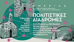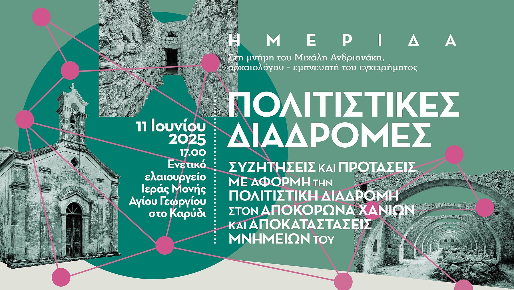 Η ημερίδα με τίτλο «Πολιτιστικές Διαδρομές: Συζητήσεις και Προτάσεις με αφορμή την Πολιτιστική Διαδρομή στον Αποκόρωνα Χανίων και αποκαταστάσεις μνημείων του», που θα πραγματοποιηθεί την Τετάρτη 11 Ιουνίου 2025 και ώρα 17.00 στην Ιερά Μονή του Αγίου Γεωργίου στο Καρύδι Αποκορώνου (αίθουσα ενετικού ελαιοτριβείου) έρχεται να συμβάλει στην περαιτέρω ανάπτυξη αυτού του προβληματισμού.