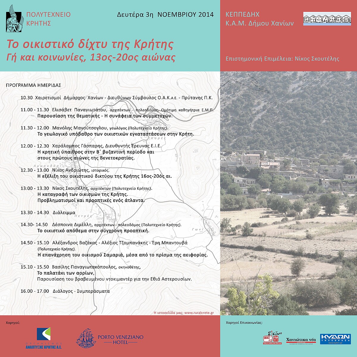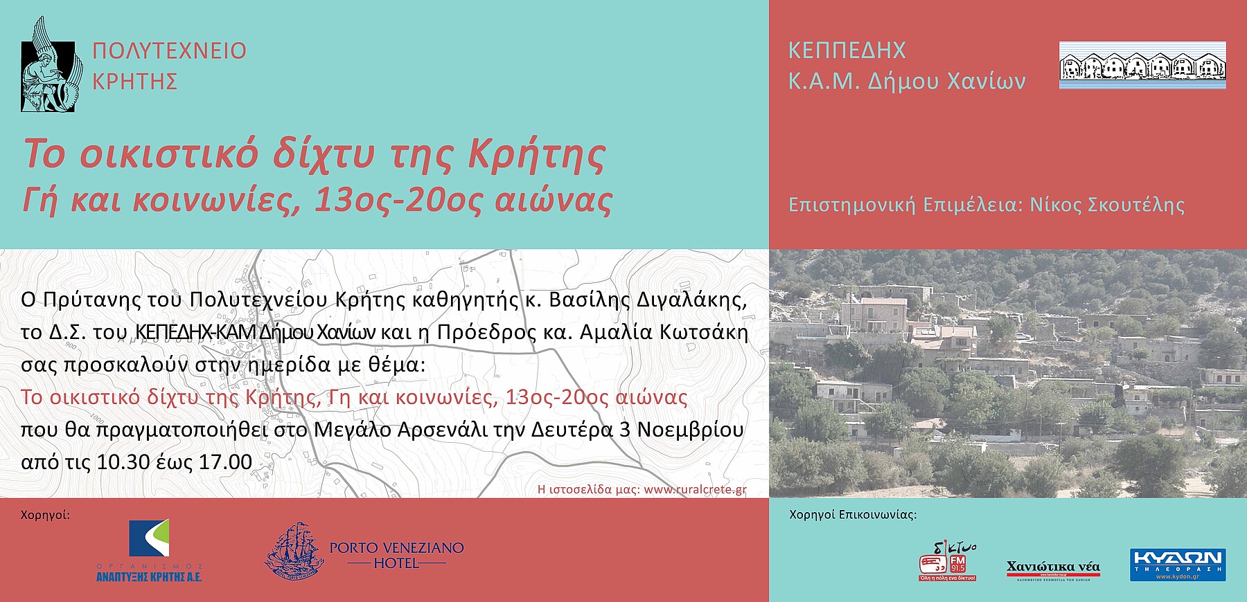 Ο Πρύτανης του Πολυτεχνείου Κρήτης Καθηγητής κ. Β. Διγαλάκης, το Δ.Σ. της ΚΕΠΠΕΔΗΧ – ΚΑΜ και η Πρόεδρος κα Αμαλία Κωτσάκη, σας προσκαλούν στην ημερίδα με θέμα «Το οικιστικό δίχτυ της Κρήτης - Γη και Κοινωνίες 13ος-20ος αιώνας», που θα πραγματοποιηθεί στο Μεγάλο Αρσενάλι την Δευτέρα, 3/11/2014 και ώρες 10:30 έως 17:00.
