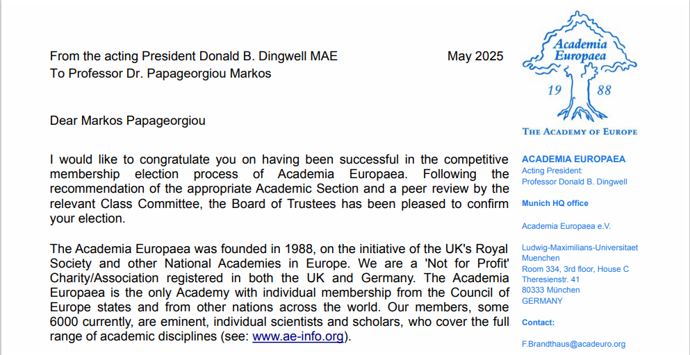 Περισσότερες πληροφορίες για την εκλογή του Ομ. Καθ. Μ. Παπαγεωργίου και την Ακαδημία της Ευρώπης μπορείτε να βρείτε στον παρακάτω σύνδεσμο: