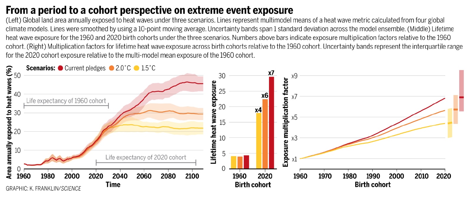 Σε επίπεδα αύξησης της παγκόσμιας θερμοκρασίας από 1,5°C και πάνω, η διά βίου έκθεση σε καύσωνες, καταστροφές καλλιεργειών, ξηρασίες και πλημμύρες για άτομα που γεννήθηκαν μετά το 1980 είναι ασυγκρίτως μεγαλύτερη από τις προ-βιομηχανικές κλιματικές συνθήκες. Όπως τονίζει ο Καθηγητής Thiery, «αυτό βασικά σημαίνει ότι οι άνθρωποι κάτω των 40 ετών σήμερα θα ζήσουν μια άνευ προηγουμένου ζωή (σ.σ. όσον αφορά τα ακραία γεγονότα) ακόμη και υπό τα αυστηρότερα σενάρια μετριασμού της κλιματικής αλλαγής».
