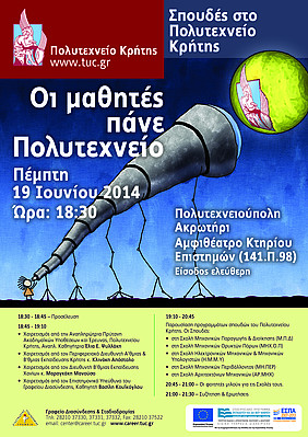 Το Πολυτεχνείο Κρήτης διοργανώνει εκδήλωση την Πέμπτη 19-6-2014 και ώρα 18.30 στο Αμφιθέατρο του Κτιρίου Επιστημών (141.Π.98), στην Πολυτεχνειούπολη με θέμα: «Οι μαθητές πάνε Πολυτεχνείο- Σπουδές στο Πολυτεχνείο Κρήτης».