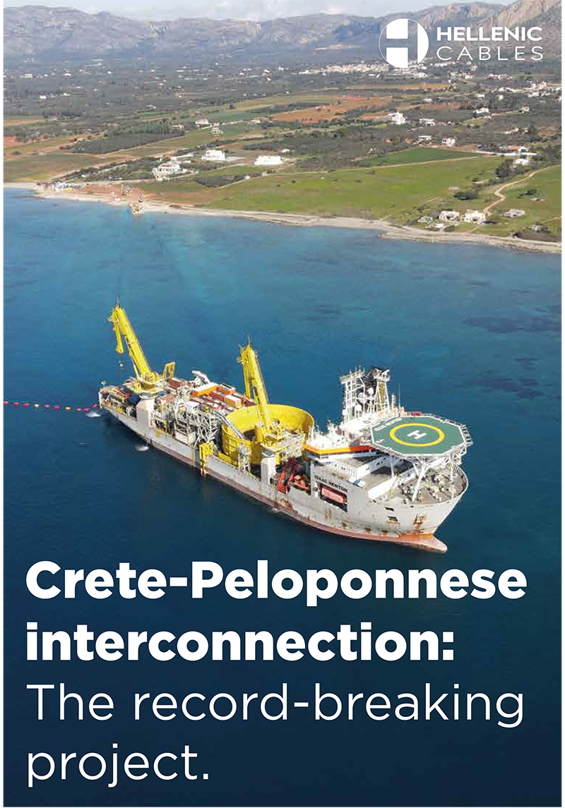 The Crete-Peloponnese circuit 1 (West-Cable) project includes the turnkey design, supply and installation of a 150kV composite submarine and underground cable system for the interconnection of Crete, Greece’s larger island, with the mainland power supply grid. This first subsea interconnection of Crete to the mainland is also the longest cable HVAC interconnection worldwide (approx. 178 Km) and the deepest one reaching water depths up to 1,000 m. The electrical interconnection of Crete-Peloponnese is a "milestone" project for Greece, as it marks the first step for the transition of Crete to clean energy.