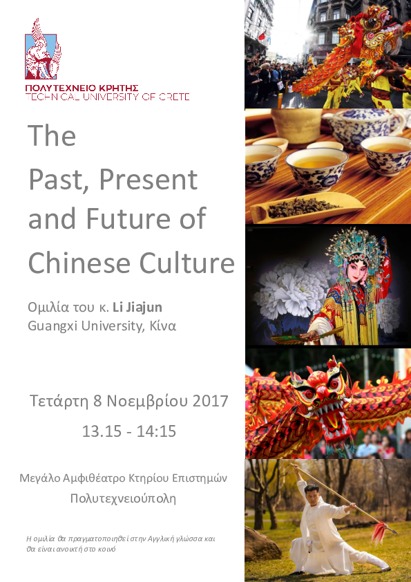 Περισσότεροι από 140 φοιτητές καθώς και άλλα μέλη της Πολυτεχνειακής κοινότητας, παρακολούθησαν την ομιλία με τίτλο "The Past, Present and Future of Chinese Culture", που έδωσε ο αναπληρωτής διευθυντής του Τμήματος Διεθνών Ανταλλαγών του Πανεπιστημίου Guangxi University της Κίνας, κ. Li Jiajun, στην Πολυτεχνειούπολη, Οι παρευρισκόμενοι είχαν την ευκαιρία να παρακολουθήσουν videos τα οποία περιλαμβάνουν θέματα όπως η πολεμική τέχνη του Kung Fu, η διάσημη Όπερα του Πεκίνου, η παραδοσιακή κινεζική μουσική και τα μουσικά όργανα, η ιδιαίτερη κουζίνα κ.α.
