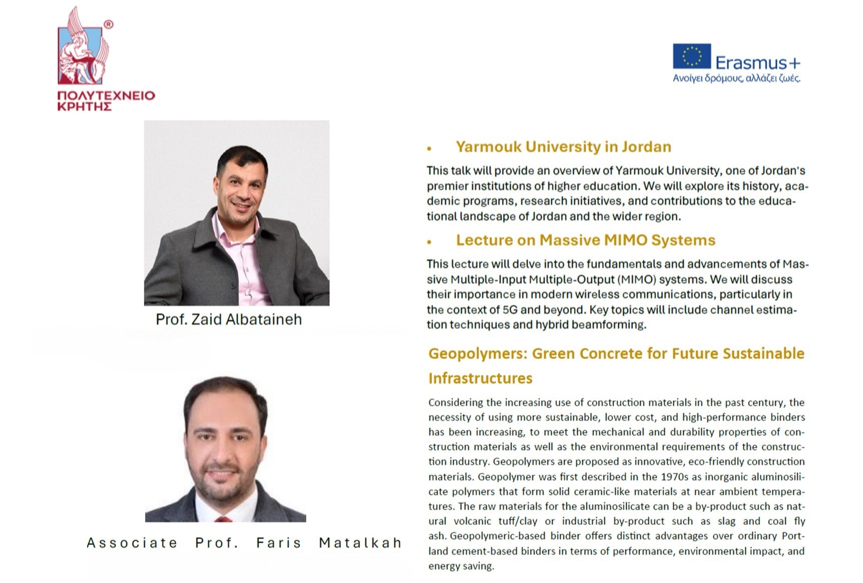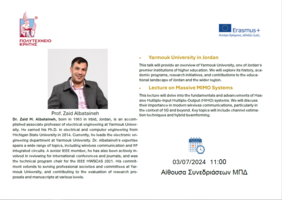 Ο Prof. Zaid Albataineh και ο Associate Prof. Faris Matalkah από το Πανεπιστήμιο Yarmouk της Ιορδανίας, θα πραγματοποιήσουν ομιλίες την Τετάρτη 3 Ιουλίου 2024, ώρα 11:00 και 12:00, αντίστοιχα, στην Αίθουσα Συνεδριάσεων της Σχολής Μηχανικών Παραγωγής και Διοίκησης.