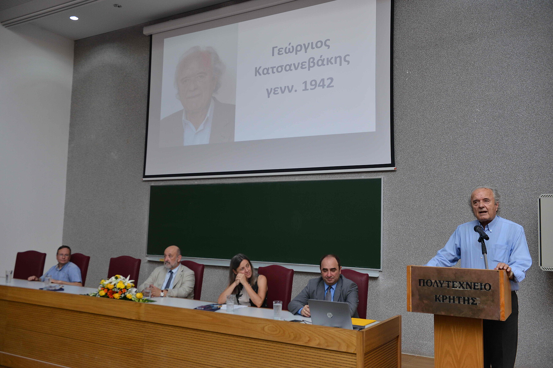 Ο Πρύτανης του Πολυτεχνείου Κρήτης, Καθ. Ευάγγελος Διαμαντόπουλος, αναφέρθηκε στο χαιρετισμό του στην απόφαση της Συγκλήτου του Ιδρύματος να τιμήσει δύο αξιόλογους ανθρώπους, οι οποίοι συνέβαλαν τα μέγιστα στην ίδρυση και στην ανάπτυξη του Ιδρύματος. Τον Μανούσο Μανουσάκη, ο οποίος από τη δεκαετία του ‘60 οραματίστηκε την ίδρυση του πρώτου περιφερειακού πανεπιστημίου, του Πανεπιστημίου Κρήτης και στη συνέχεια στη δεκαετία του ‘70, ως μέλος του ΤΕΕ/ΤΔΚ, την ίδρυση του Πολυτεχνείου Κρήτης με έδρα τα Χανιά. Τον Γεώργιο Κατσανεβάκη, ο οποίος από τις σημαντικές θέσεις που κατείχε, ως Πρόεδρος του ΤΕΕ/ΤΔΚ, ως Δήμαρχος Χανίων και ως μέλος των πρώτων Διοικουσών Επιτροπών, συνέβαλε καθοριστικά στην ίδρυση, τη λειτουργία και την ανάπτυξη του Ιδρύματος.